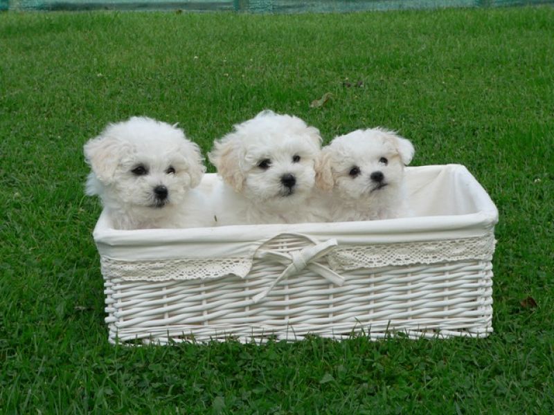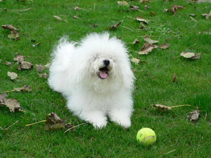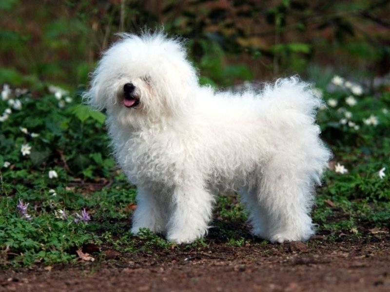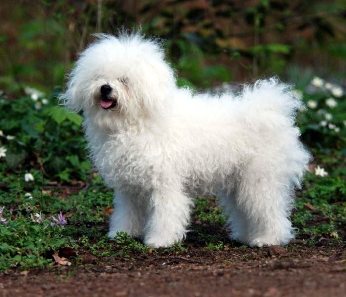 Kleine, vierkant gebouwde hond met een witte krulvacht.