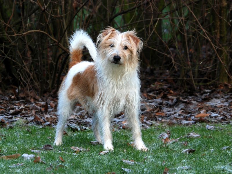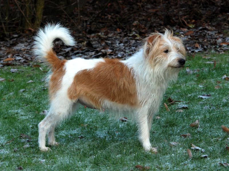 Kort, recht en ruw haar, met baardje, aan de achterhand wat langer, wit met bruine vlekken.
