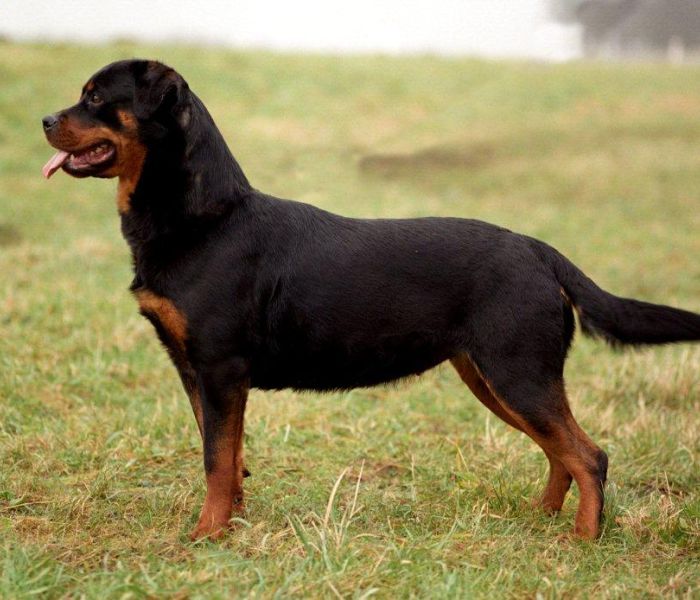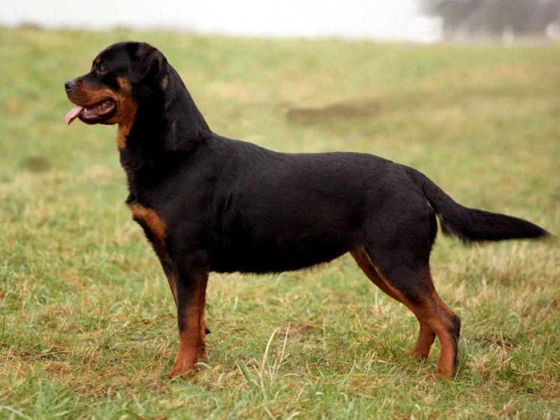 De Rottweiler is een middelgrote tot grote, stevige hond. Hij is niet plomp maar ook niet licht van bouw en oogt ook niet hoogbenig of iel. Zijn in de juiste verhouding staande gedrongen krachtige verschijning verraadt grote kracht, wendbaarheid en uithoudingsvermogen. De Rottweilerfokker streeft naar een zeer krachtige hond, zwart met roodbruine duidelijk begrensde aftekeningen. De schofthoogte bij teven is 56 tot 63 cm en bij reuen 61 tot 68 cm. De leeftijd van normale Rottweilers ligt boven de 10 tot 12 jaar; sommige honden worden veel ouder.