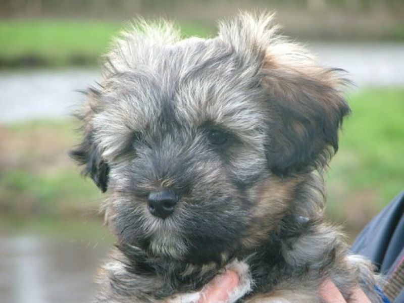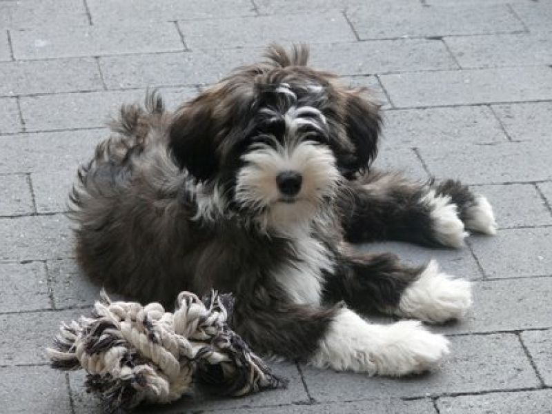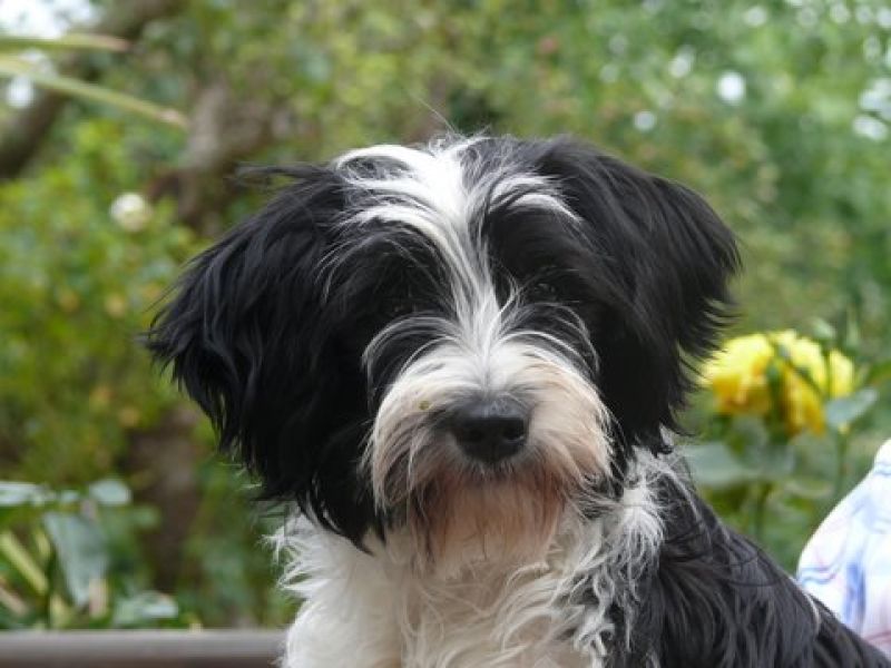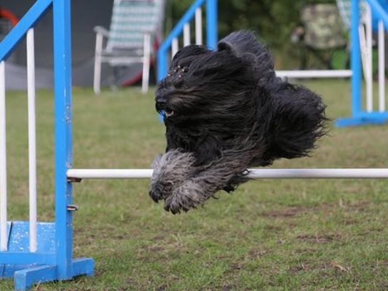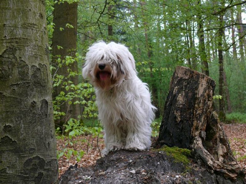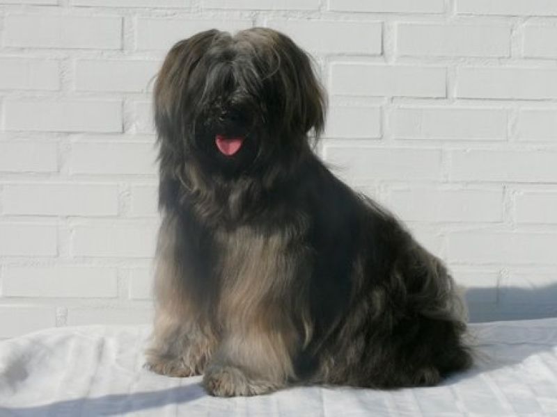 Middelgrote, langharige, robuuste hond met een vastberaden uitdrukking van onder de beharing die het hoofd bedekt.
